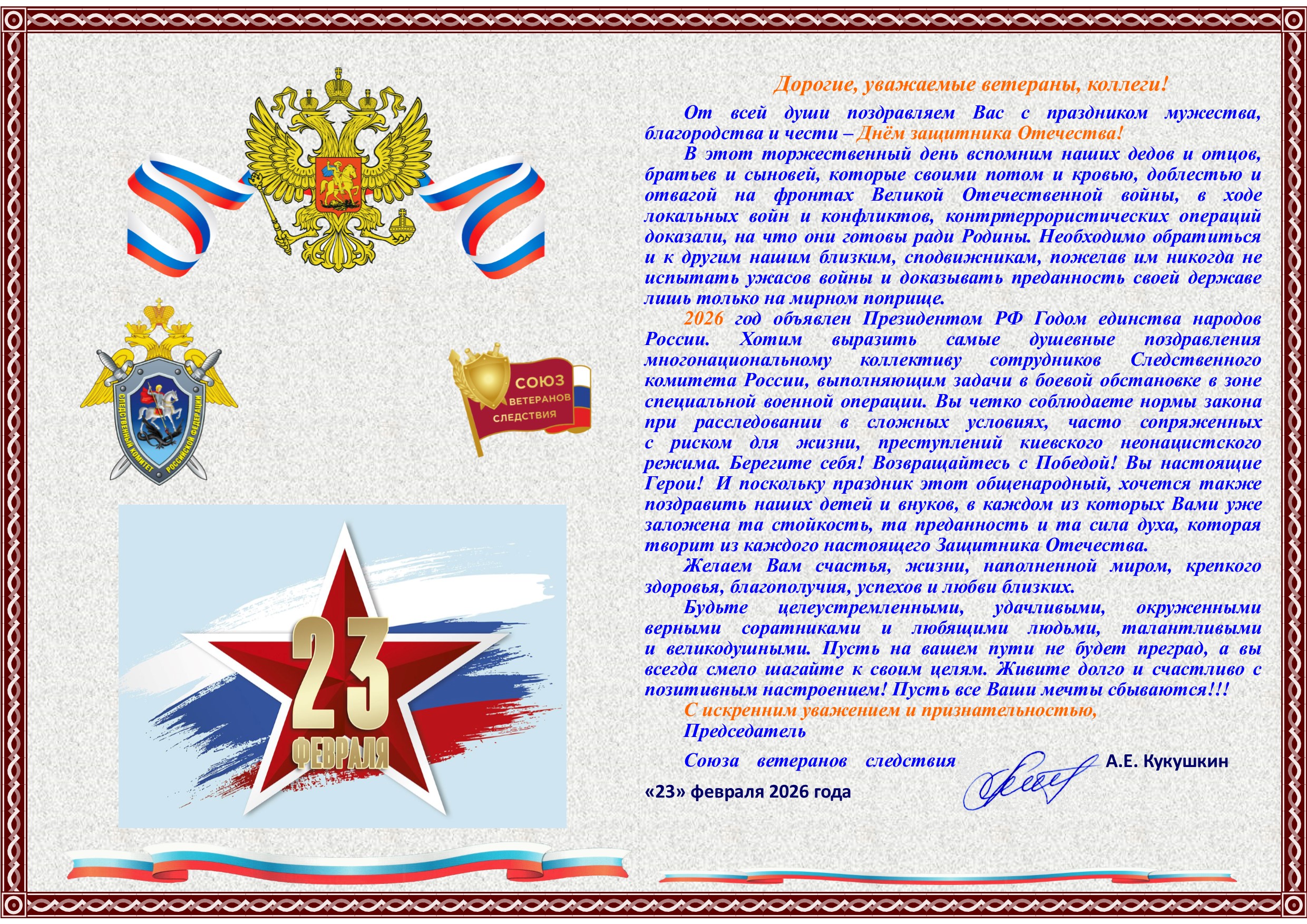 Поздравление от имени Президиума Союза ветеранов следствия с Днем защитника Отечества