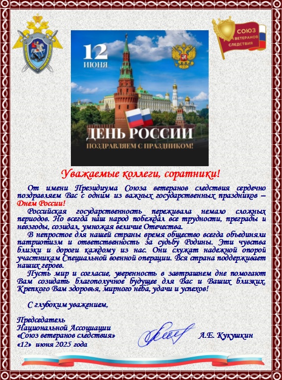 Поздравление С Днем России от имени Президиума Союза ветеранов следствия