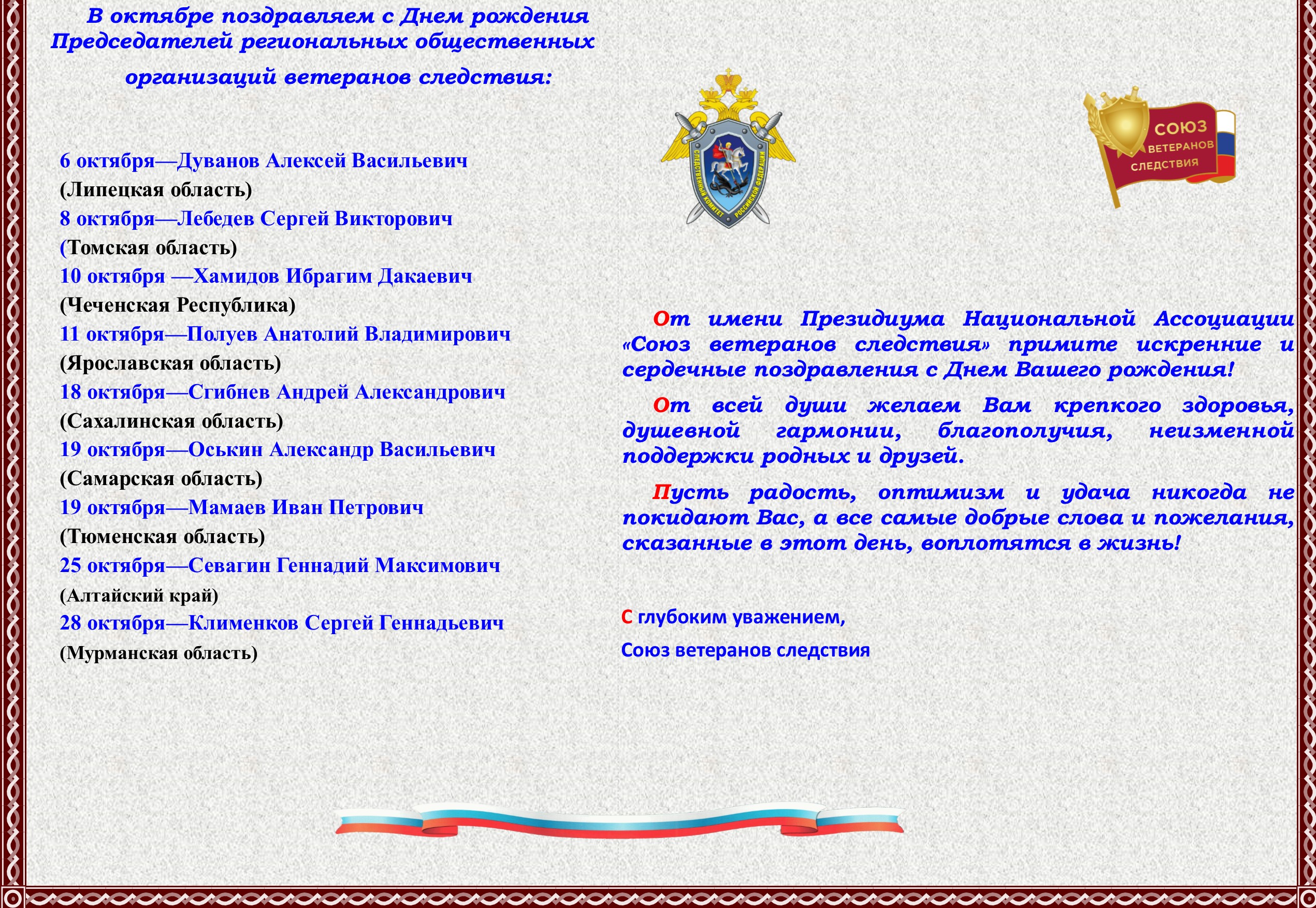 Поздравляем Председателей региональных общественных организаций ветеранов следствия с Днем рождения (декабрь)