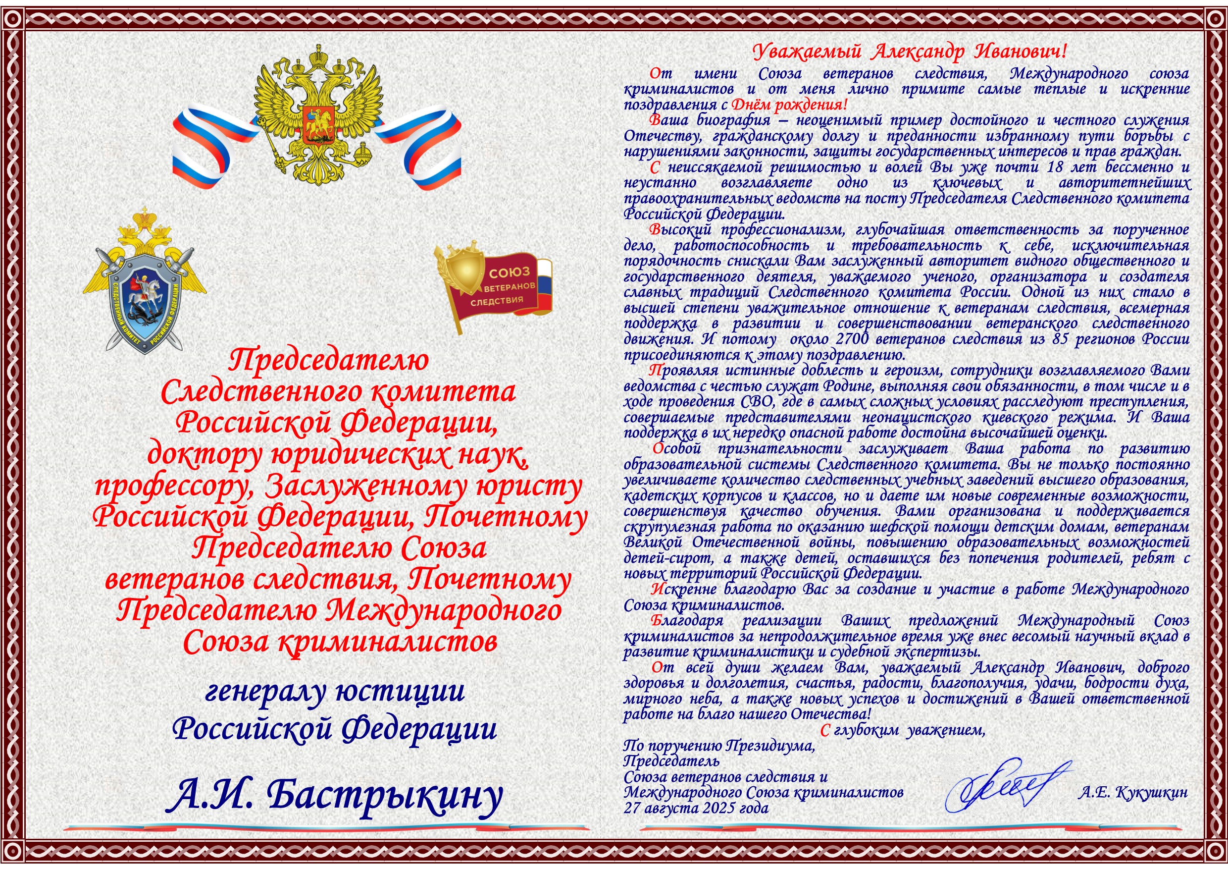 Поздравление Председателя Следственного комитета Российской Федерации А.И. Бастрыкина с Днём рождения от имени руководства и членов Союза ветеранов следствия