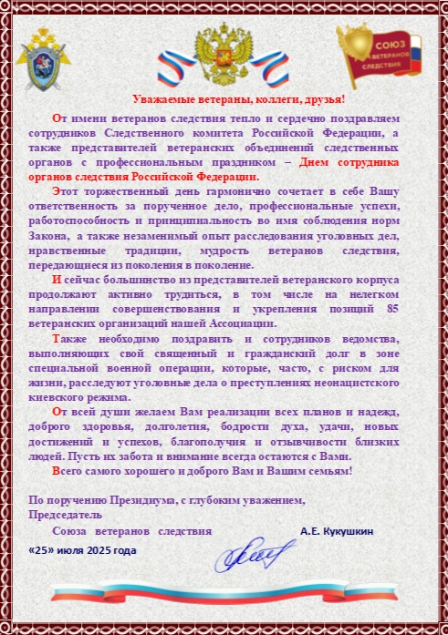 Поздравление Председателя НАОВСО А.Е. Кукушкина с Днём сотрудника органов следствия РФ