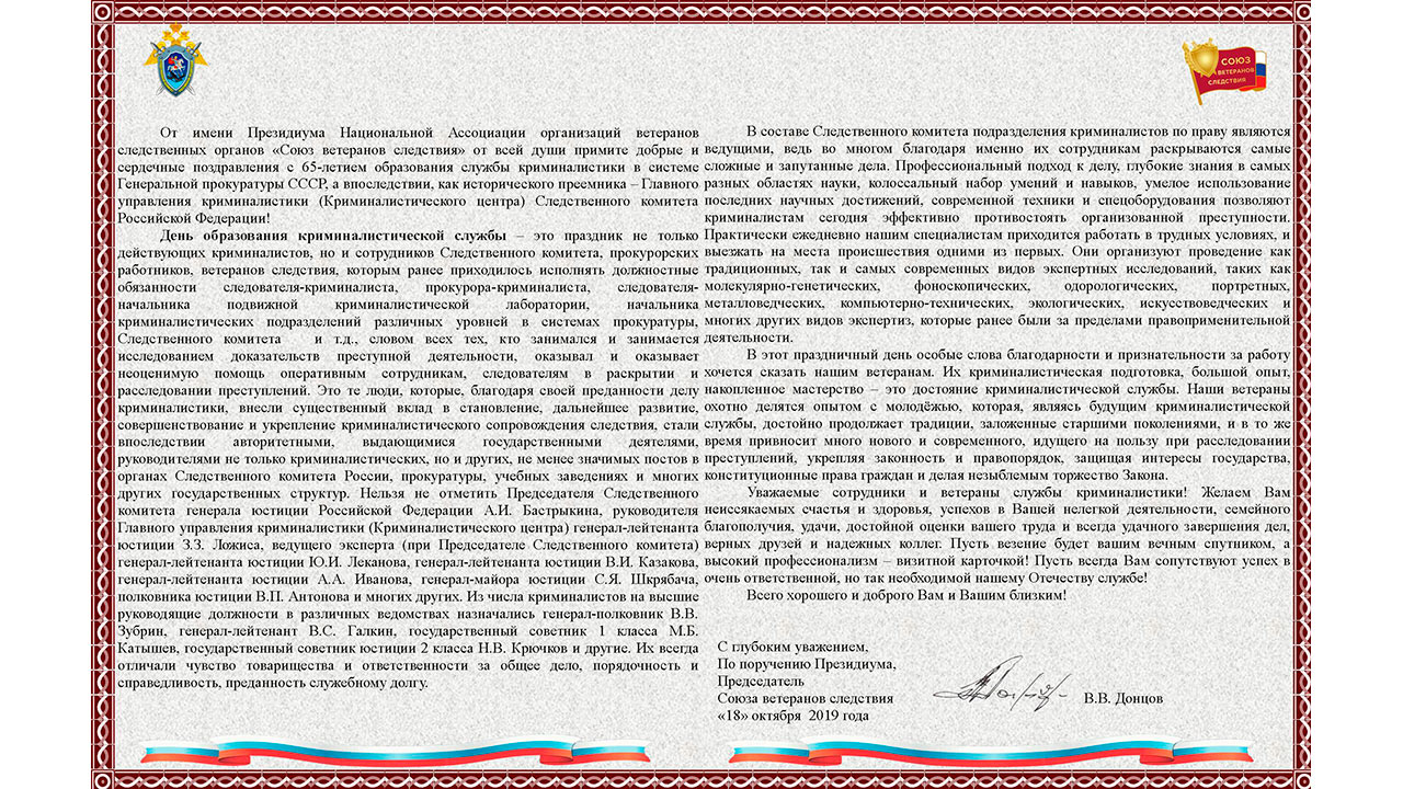 Поздравление В.В. Донцова с 65-летием образования службы криминалистики