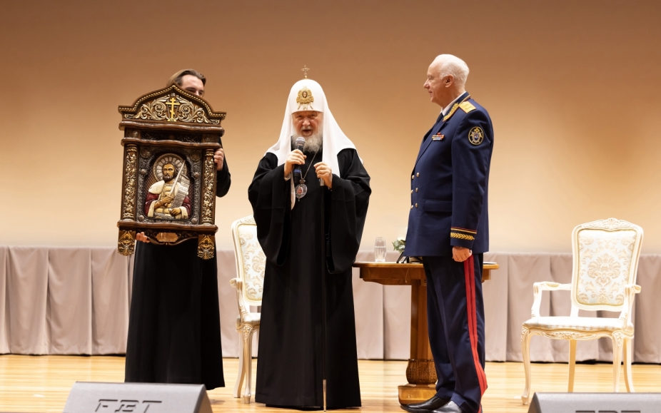 Поблагодарив за интересную дискуссию, Председатель Следственного комитета России вручил Святейшему Патриарху Московскому и всея Руси ведомственную медаль «За заслуги». В свою очередь Святейший Владыка передал в дар Следственному комитету икону святого благоверного князя Александра Невского.